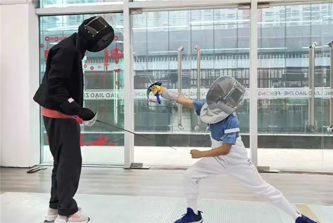 图为教练与学员练习击剑。